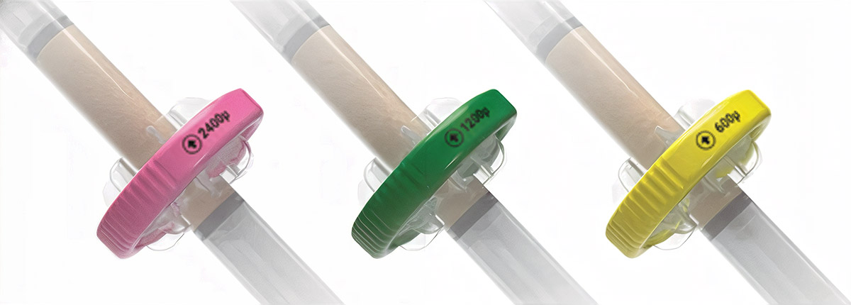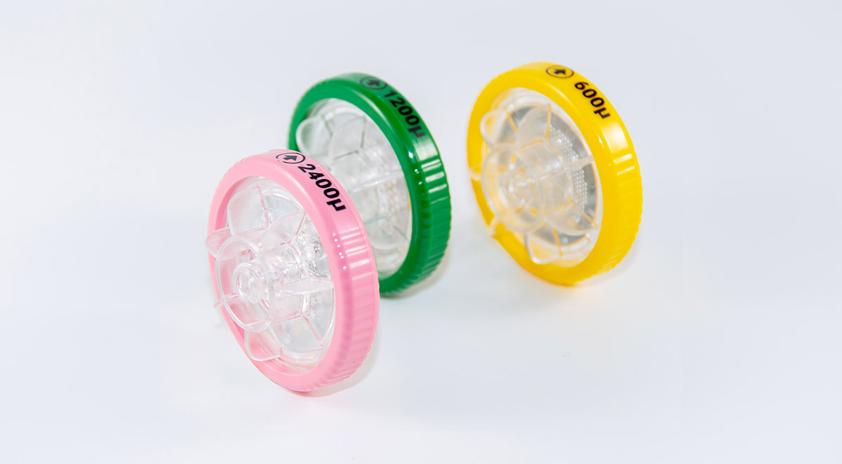 I micronizzatori utilizzati nel kit J.A.K. sono 3, dotati di porosità decrescente: 2400 µm (rosa), 1200 µm (verde) e 600 µm (giallo). I 3 micronizzatori possono essere utilizzati in sequenza per avere il massimo del ridimensionamento, del rilascio cellulare e della micronizzazione del tessuto adiposo oppure ci si può fermare all’utilizzo del primo o dei primi due per ottenere una MAM più densa e strutturata. Il Medico può quindi scegliere la viscosità della MAM da iniettare.