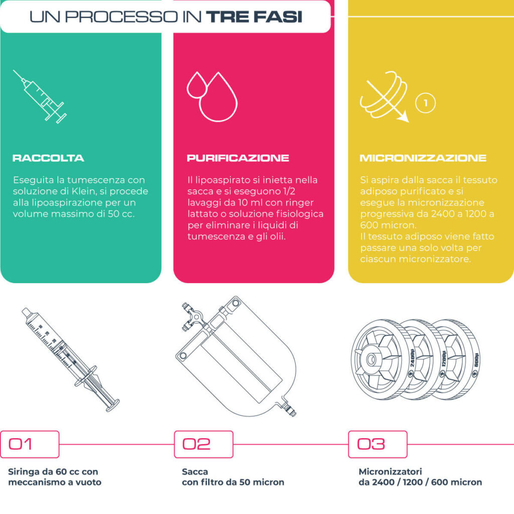 In particolare, la micronizzazione è un processo che viene eseguito interamente in campo sterile nel medesimo tempo chirurgico della lipoaspirazione. La tecnica prevede la lipoaspirazione, la purificazione del lipoaspirato e la sua successiva micronizzazione mediante l’utilizzo di micronizzatori in serie a porosità decrescente, dotati di migliaia di microlame, attraverso i quali viene fatto passare il lipoaspirato.