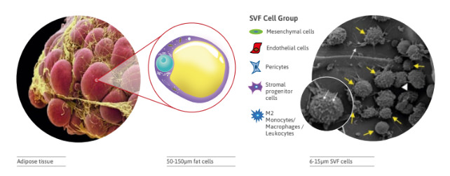 La frazione vascolo-stromale (SVF) è l’insieme eterogeneo di cellule non adipose e rappresenta circa il 15-20% delle cellule totali. Comprende: ADMSCs (circa il 10-15%), periciti, pre-adipociti, fibroblasti, cellule endoteliali e loro progenitori, globuli bianchi (es. macrofagi) e altre cellule del sangue. La SVF può essere ottenuta dal tessuto adiposo in due modi: tramite digestione enzimatica (con collagenasi, manipolazione estensiva non consentita) che libera le cellule dal loro substrato, oppure tramite metodi meccanici che frammentano il tessuto mantenendo però parte della matrice (tecnica di manipolazione minima consentita); in tal caso si parla di SVF tissutale (tSVF) anziché SVF cellulare (cSVF) (Trivisonno et al. 2019).