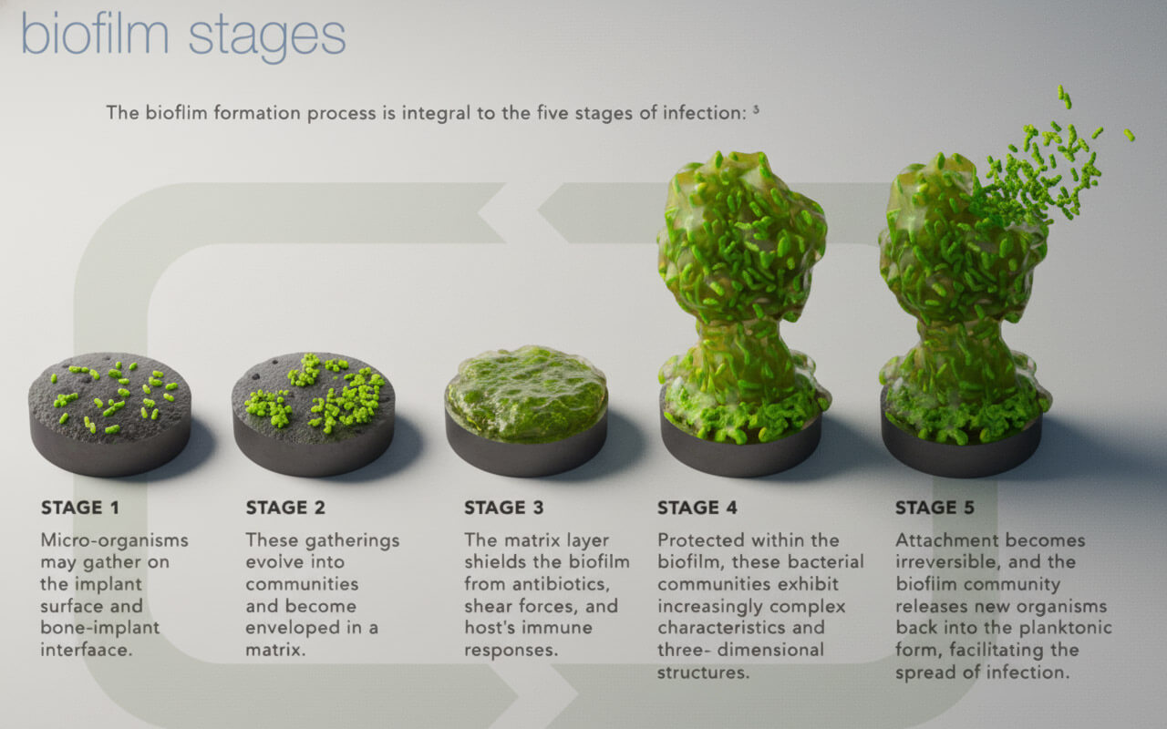 Una delle principali cause di fallimento nel trattamento delle infezioni impianto correlate è la presenza del biofilm. Il biofilm è una matrice polisaccaridica strutturata secreta dalle cellule dei microrganismi organizzati in colonie. All’interno del biofilm possono trovarsi colonie di differenti specie, che causano infezioni polimicrobiche. Il biofilm protegge le colonie dalla risposta immunitaria del paziente, inibisce l’efficacia dell’antibiotico infuso per via sistemica, promuove lo sviluppo di resistenze da parte delle colonie e le mantiene vitali, garantendone la diffusione e la colonizzazione di altri distretti, portando all’espansione dell’infezione in atto. Il biofilm raramente può essere rimosso dal trattamento farmacologico per via sistemica e spesso causa infezioni ricorrenti e croniche che possono portare anche a sepsi. Si rende necessario dunque un approccio chirurgico multidisciplinare per la gestione del paziente soggetto ad infezione impianto correlata (Clayman et al. 2023).