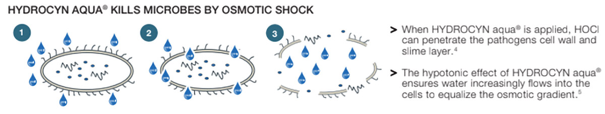 Diversi studi hanno dimostrato che Hydrocyn Aqua® possiede una potente attività antimicrobica ad ampio spettro contro batteri Gram+ e Gram−, funghi e virus, compresi ceppi multiresistenti come MRSA e Pseudomonas aeruginosa. Riduce efficacemente la carica batterica e disgrega il biofilm polimicrobico fino al 99% con brevi tempi di contatto (Day et al. 2017; Sakarya et al. 2014; Kramer et al. 2018; Harriot et al. 2019).