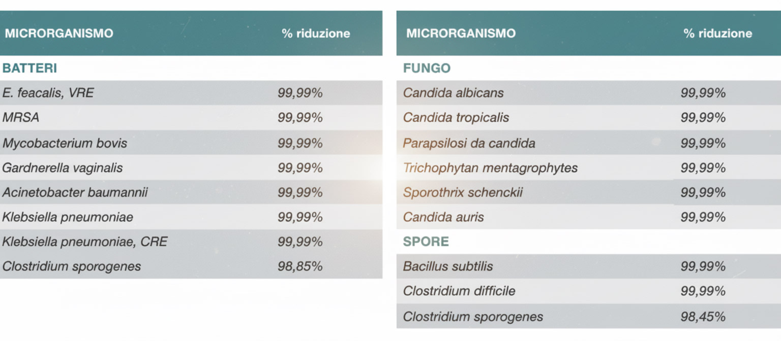 I test effettuati su vari microrganismi secondo le direttive ISO 11737 & ASTM E2315 dimostrano un’efficacia pari al 99,9% contro batteri Gram+, Gram-, funghi e spore con un tempo di contatto minimo di 60 secondi.