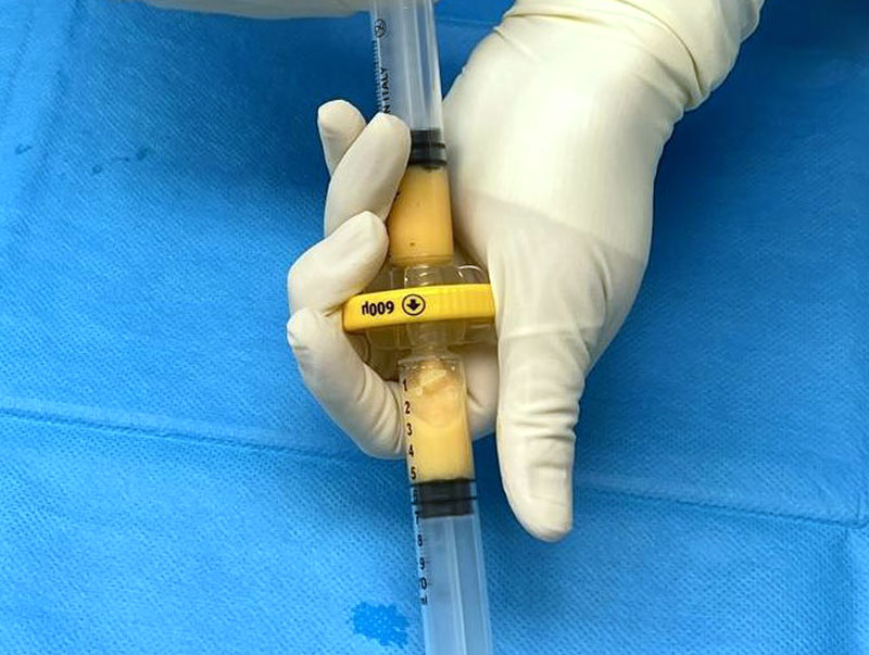 Si aspira dalla sacca il tessuto adiposo purificato e si esegue la micronizzazione progessiva da 2400 a 1200 e 600 micron. Il tessuto adiposo viene fatto passare una sola volta per ciascun micronizzatore.