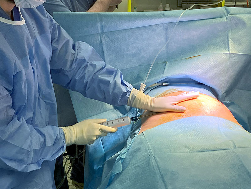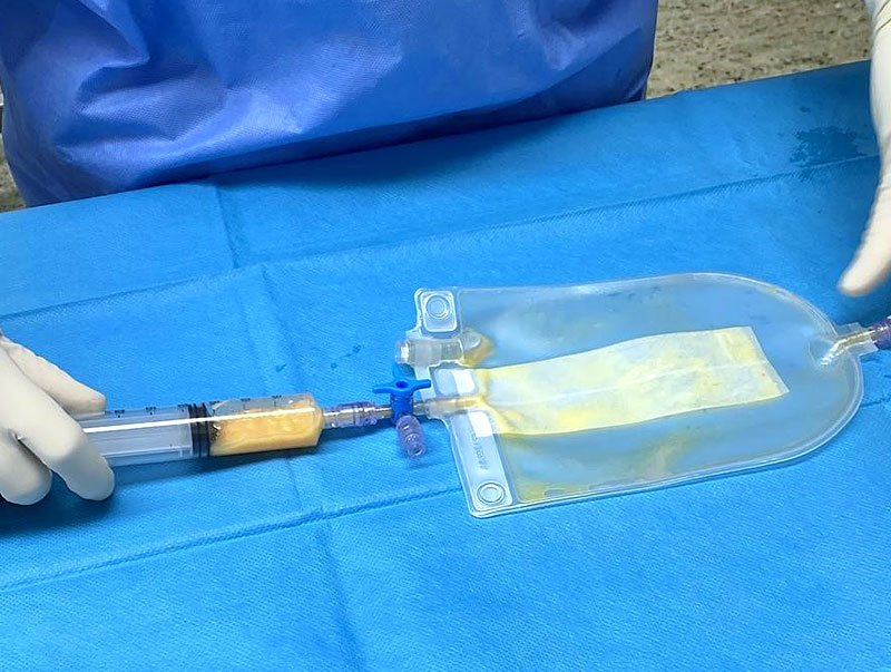 Il lipoaspirato si inietta nella sacca e si eseguono 1/2 lavaggi da 10 ml con ringer lattato o soluzione fisiologica per eliminare i liquidi di tumescenza e gli olii.